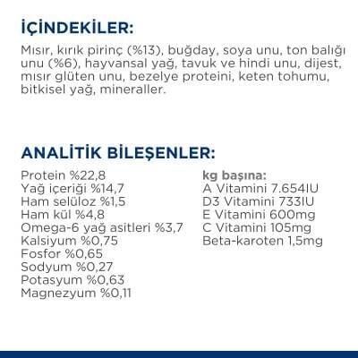 - Omega-3 ve Omega-6 yağ asitleri ile sağlıklı deri ve parlak tüyler desteklenir.