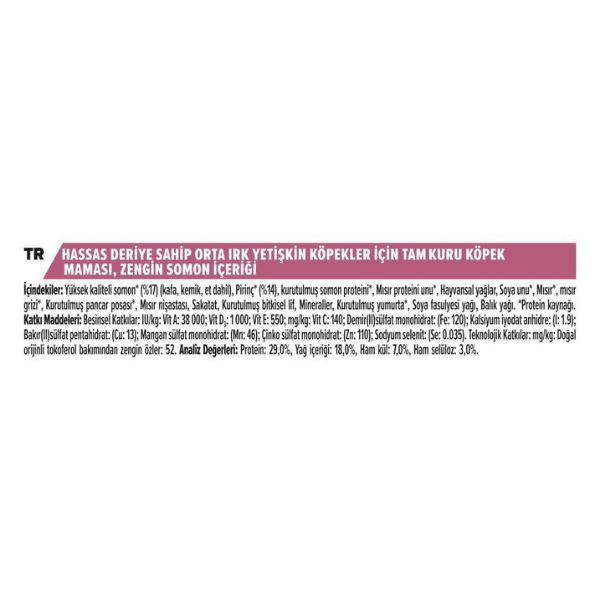 1 - 7 yaş arasındaki ortam ırk yetişkin köpeklerin beslenmesine uygun olarak geliştirilmiş, somon ve pirinç içeriği ile protein ve karbonhidrat bakımından zengin, yüksek lezzet ve sindirilebilirliğe sahip, yetişkin köpek mamasıdır. Gerçek somon etinden sağlanan % 30 protein içeriği, zenginleştirilmiş optimal protein ve kalori oranı ile güçlü, sağlıklı kas yapısını destekler.