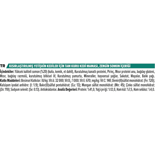* Somon Eti, Mısır Glüteni, Pirinç, Kümes Hayvanları Ürünleri, Mısır, Maya, Balık Ürünü, Ton Balığı Eti, Sakatat, Selüloz, Buğday Glüteni, Bütün Yumurta, Maya, Karışık Tokoferollerle Korunmuş Hayvansal Yağ, Potasyum Klorür, Kolin Klorür, l-Lizin, DL-Metionin, Sodyum Klorür, Mineraller, Çinko Sülfat, Selenyum, Beta Karoten, Doğal Tokoferolce Zengin Ekstratlar, Orto Fosforik Asit, Vitamin A Takviyesi, Vitamin D3 Takviyesi, Vitamin E Takviyesi, Vitamin C Takviyesi, Tuz