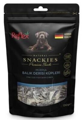 Reflex Snackies Morina Balık Derisi Küpleri 130 gr Hayvanlardan elde edilen tek proteinli köpekler için tamamlayıcı yem. Düşük yağ oranına sahip ve değerli Omega-3 yağ asitleri açısından zengin, ince, nazikçe hava kurutulmuş morina derisi küpleri.
