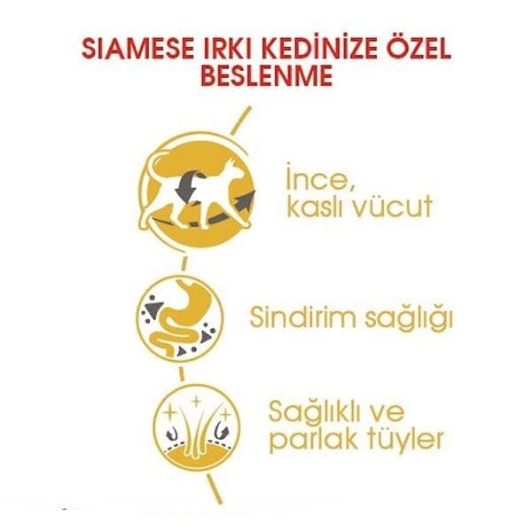 Kas Kütlesi Desteği: Siyam kedilerinin atletik yapısına uygun, yüksek protein içeriği ile kas kütlesinin korunmasına yardımcı olur. İdeal Kilo Yönetimi: L-karnitin takviyesi ile yağ yakımını destekler ve ideal kilonun korunmasına katkıda bulunur. Sindirim Sağlığı: Yüksek sindirilebilir proteinler ve prebiyotikler ile sağlıklı bir sindirim sistemini destekler. Ağız ve Diş Sağlığı: Siyam kedilerine özel tasarlanmış kroket yapısı ile çiğnemeyi teşvik eder ve ağız hijyenine yardımcı olur. Tüy ve Cilt Sağlığı: Özel vitamin ve mineral dengesi ile parlak tüyleri ve sağlıklı cildi destekler.Royal Canin Siamese Yetişkin Siyam Kedi Maması Avantajları;