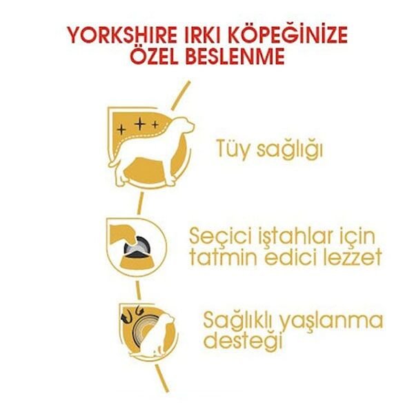 Royal Canin Yorkshire Terrier Yetişkin, 10 aylıktan büyük yetişkin ve olgun Yorkshire Terrier lere özel mamadır. Özel formülü ile Yorkshire Terrier cinsi dostunuzun uzun kürkünün sağlıklı kalmasına yardımcı olur. Bu formül dışkı kokusunun ve hacminin azaltılmasına yardımcı olur. Bu formül, özel aroma kombinasyonları sayesinde, en zor beğenen Yorkshire Terrier ’lerin bile iştahını açar.