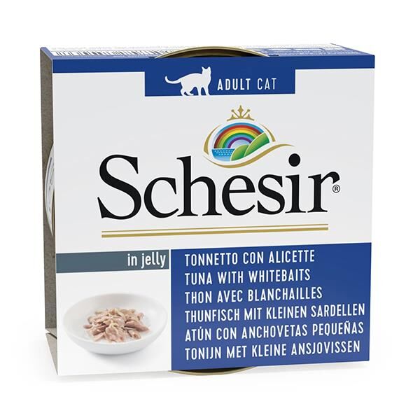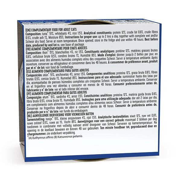 Schesir Ton Balıklı ve Ringa Balıklı Kedi Konservesi, yumuşak jöle içerisinde buharda pişirilmiş et ile hazırlanmış ıslak mamadır.